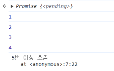 increaseAndPrint(0).then(n=>{ return increaseAndPrint(n) }).then(n=>{ return increaseAndPrint(n) }).then(n=>{ return increaseAndPrint(n) }).then(n=>{ return increaseAndPrint(n) }).then(n=>{ return increaseAndPrint(n) }).catch(e => { console.log(e); });이렇게 작성 후 실행 하면,,