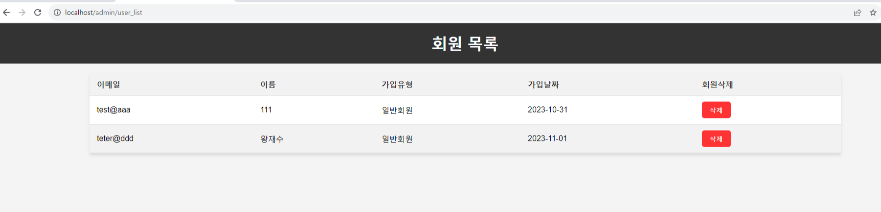 <!DOCTYPE html> <html xmlns:th="http://www.thymeleaf.org"> <head> <title>회원 목록</title> <style> <!-- 넘 길어져서 비워둠 --> </style> </head> <script src="https://code.jquery.com/jquery-3.6.0.min.js"></script> <body> <h1>회원 목록</h1> <table> <thead> <tr> <th>이메일</th> <th>이름</th> <th>가입유형</th> <th>가입날짜</th> <th>회원삭제</th> </tr> </thead> <tbody> <tr th:each="member : ${members}" th:if="${member.email != 'admin@aaa'}"> <td th:text="${member.email}"></td> <td th:text="${member.name}"></td> <td th:text="${member.provider}"></td> <td th:text="${member.joinDate}"></td> <td> <button th:onclick="'deleteMember(\'' + ${member.id} + '\')'">삭제</button> </td> </tr> </tbody> </table> <script> function deleteMember(memberId) { if (confirm('정말로 이 회원을 삭제하시겠습니까?')) { $.ajax({ type : 'DELETE', url : '/admin/deleteMember/' + memberId, success : function(response) { if (response === 'success') { // 삭제 성공한 경우, 페이지를 새로고침합니다. location.reload(); } else { console.log("삭제 중 예외 발생"); alert('삭제 중 오류가 발생했습니다.'); } }, error : function() { alert('삭제 중 오류가 발생했습니다.'); } }); } } </script> </body> </html>여기서 보면 script function 안에 ajax 가 있는 걸 확인 할 수 있다.