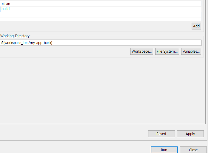 동그라미 표시 클릭 후 빌드 할 프로젝트 찾기 4. add를 클릭 해 clean build 추가 후 apply and run