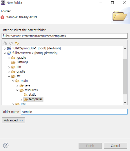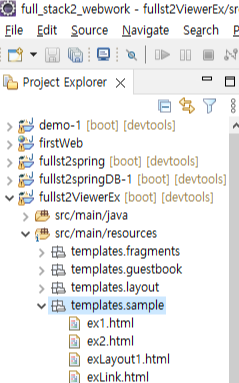 package comfullstack2.ph1.controller; import java.time.LocalDateTime; import java.util.List; import java.util.stream.Collectors; import java.util.stream.IntStream; import org.springframework.stereotype.Controller; import org.springframework.ui.Model; import org.springframework.web.bind.annotation.GetMapping; import org.springframework.web.bind.annotation.RequestMapping; import org.springframework.web.servlet.mvc.support.RedirectAttributes; import comfullstack2.ph1.SampleDTO; import lombok.extern.log4j.Log4j2; @Controller @RequestMapping("/sample") @Log4j2 public class SampleControler { @GetMapping({"/ex2"}) // 배열 방식으로 요청 패스를 , 를 기준으로 나열 할 수 있습니다. public void ex2(Model model) { List<SampleDTO> list = IntStream.rangeClosed(1, 20) .asLongStream() .mapToObj(value -> { SampleDTO dto = SampleDTO.builder() .sno(value) .first("first" + value) .last("last" + value) .regTime(LocalDateTime.now()) .build(); return dto; }).collect(Collectors.toList()); // Model 객체는 Business 로직을 처리하는 객체라고 했듯이, 처리된 결과를 viewer 에서 사용하게 된다. // 이때 Model 객체를 특정 영역 속성을 이용해서 뷰어에게 넘겨주는데, // 이때 사용하는 메서드가 jsp 에 봤듯이 setAttribute 이다. // 이렇게 하면 viewer 에서 key 를 찾아서 value 를 보여주는 역할이다. model.addAttribute("list", list); } }이제 viewer 인 ex2.html 을 생성해야하는데 ex2 는 sample 이라는 폴더 하위에 있는 html 파일로 생성해줘야한다.