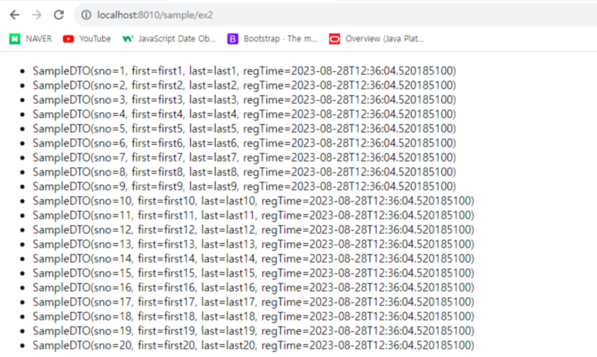 package comfullstack2.ph1; import java.time.LocalDateTime; import lombok.Builder; import lombok.Data; @Data @Builder(toBuilder = true) public class SampleDTO { private Long sno; private String first; private String last; private LocalDateTime regTime; }controller에 로직을 작성한다.