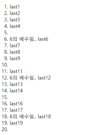 5의 배수인 것은 값이 출력되지 않고 6의 배수인 것은 6의 배수임.. 으로 출력되며 두 조건에 포함되지 않는 값은