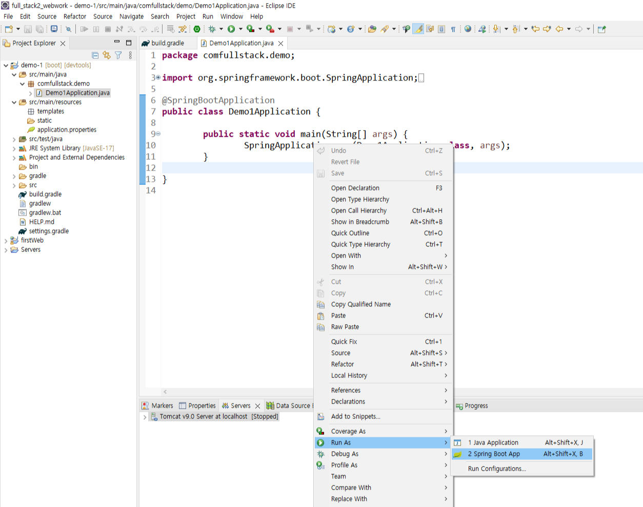 위 사진에 열린 java 파일이 spring boot 에 main 실행 파일이다.